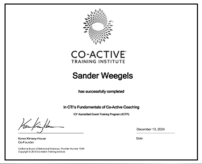 Afgegeven door Co-Active Instituut dat erkend is door het ICF (International Coaching Federation).
